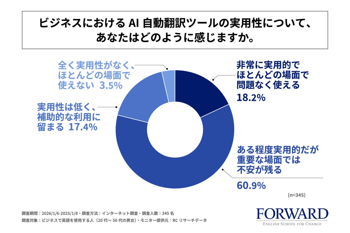企業で英語を使用する人々のうち、実に6割以上がAI自動翻訳ツールに対し「実用的だが、重要な場面では不安がある」と感じています。この調査は、株式会社ランゲージ・ティーチング・レボリューションズが運営する英語学校「FORWARD」によって実施されました。