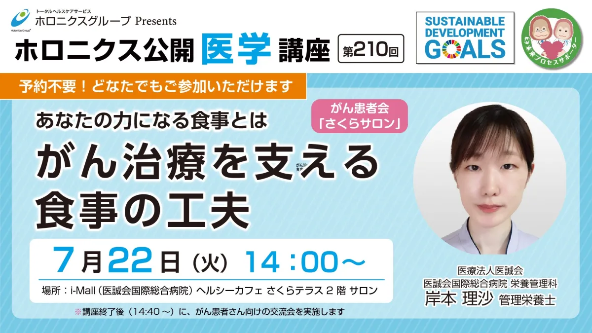 医療法人医誠会は、2025年7月22日(火)に大阪市北区にあるi-Mall内のヘルシーカフェ「さくらテラス」で、第210回ホロニクス公開医学講座を開催します。本講座のテーマは『あなたの力になる食事とはがん治療を支える食事の工夫』です。がん患者やその家族、地域の皆様への支援を目的としているこの講座は、参加者が多くの学びを得る貴重な機会となります。