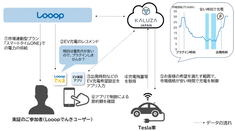 株式会社LooopとKaluza Japanが協力し、再生可能エネルギーの普及と利用推進に向けた「市場連動型電気料金プランに合わせたEVの自動制御実証」を開始しました。この取り組みは、2025年10月1日から2026年3月31日までの期間に実施され、対象は「Looopでんき」の市場連動型料金プラン「スマートタイムONE」を契約している72世帯のTeslaオーナーです。