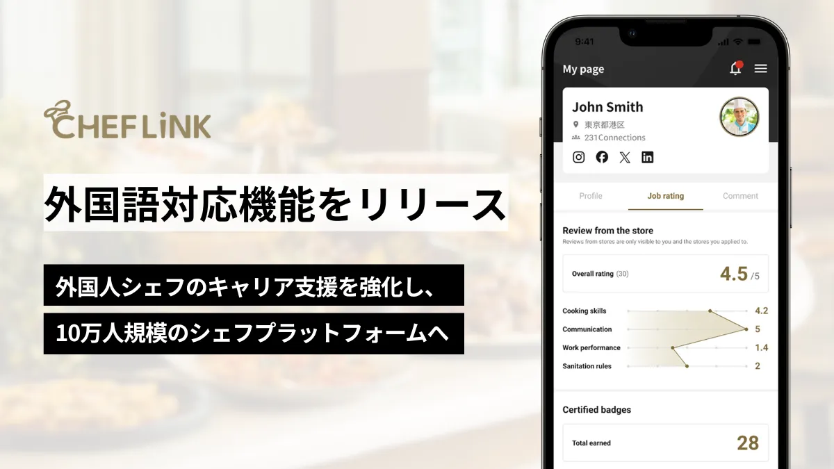 株式会社シェアダインが運営する「CHEFLINK(シェフリンク)」は、近年の挑戦的な取り組みとして外国語対応機能を実現しました。特に第一弾として英語に対応することで、就労資格を持つ外国籍シェフへの支援強化を図っています。これにより、キャリアアップやスキル向上を目指す外国籍シェフと国内の飲食事業者とのマッチング機会が拡大する見込みです。