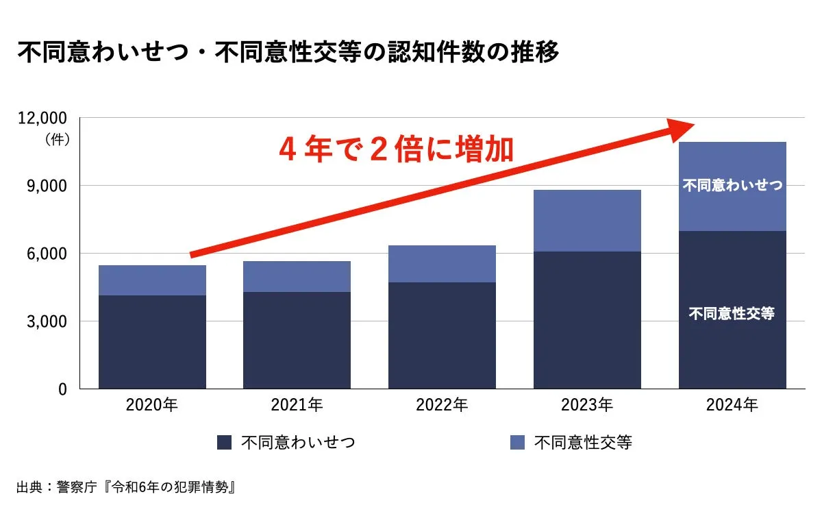 近年、性犯罪の件数が急増していることが警察庁の統計から明らかになっています。2020年には5,486件だった不同意わいせつや性交等の件数が、2024年にはなんと10,928件まで倍増しました。ストーカーに関する相談も依然として年間2万件近くに達しており、性犯罪に対する社会的な不安は増す一方です。そのため、特に春から夏にかけては外出が増える季節であり、性犯罪の発生数が高まる傾向が研究で示されています。