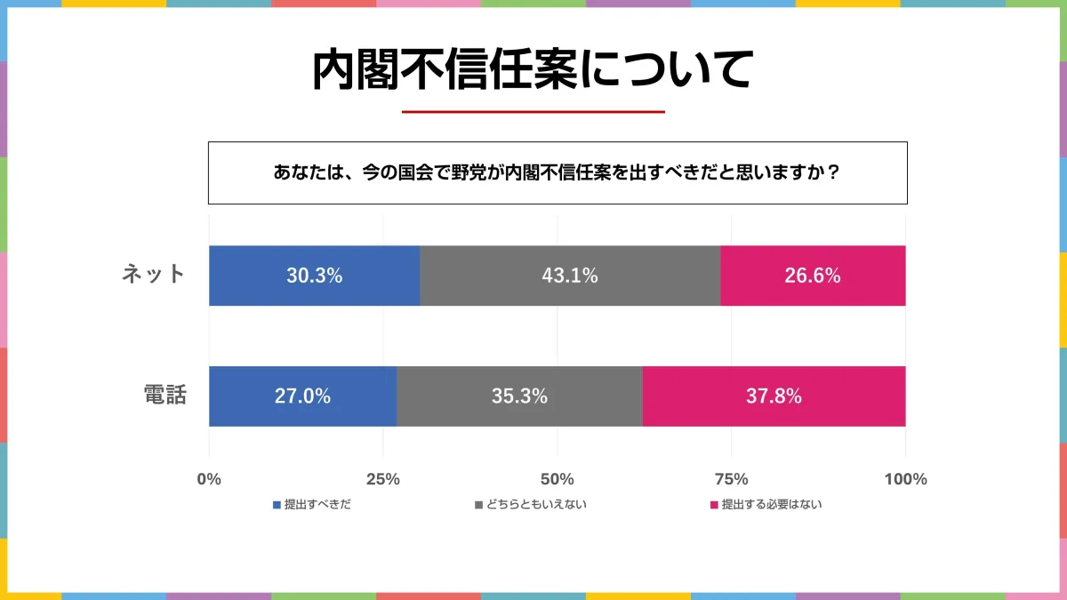 この意識調査は、現在の国会における野党の立場を見極める目的で実施されました。質問内容は「あなたは、今の国会で野党が内閣不信任案を出すべきだと思いますか?」というもので、選択肢は「提出すべきだ」「提出する必要はない」「どちらともいえない」の3つでした。