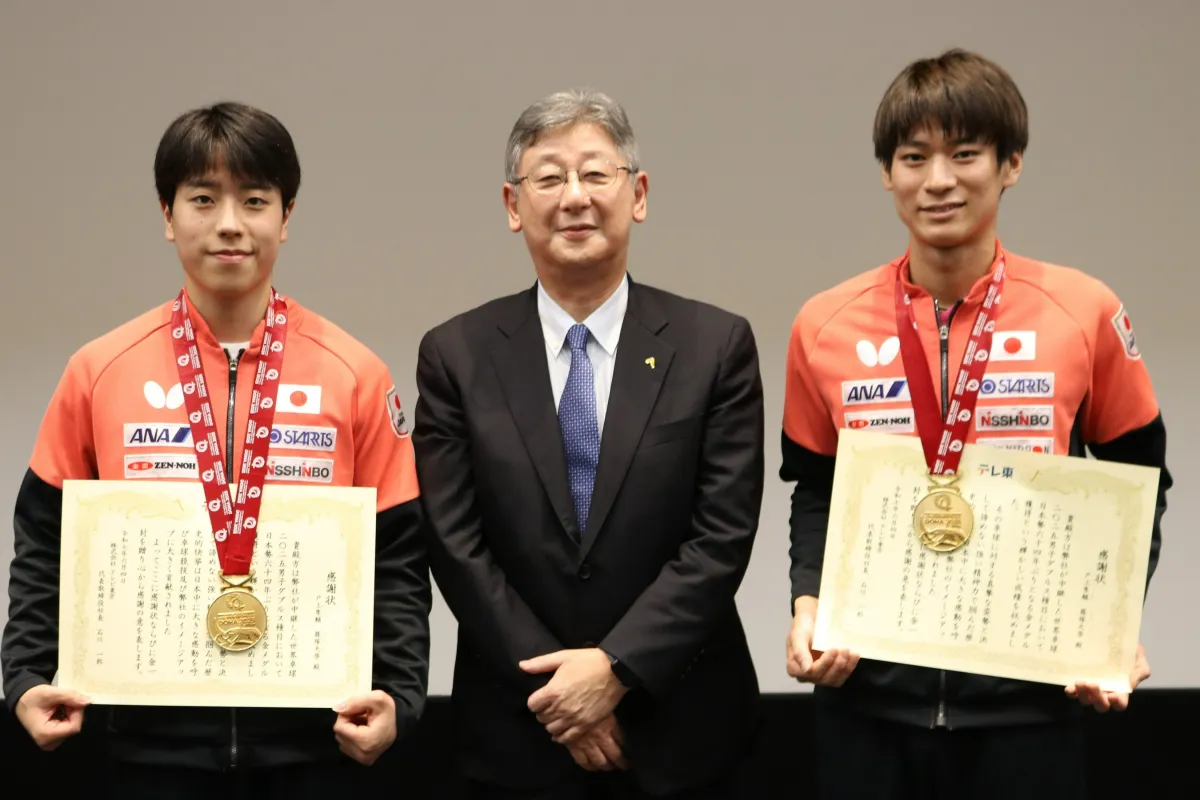 その栄誉を称え、テレビ東京は6月4日、同社本社にて特別表彰を実施。社長の石川一郎氏から、感謝状と金一封が贈呈されました。この表彰式には、100名を超えるテレビ東京グループの社員が集まり、選手たちとその瞬間を振り返る喜びを分かち合いました。戸上選手と篠塚選手は、社員の熱い応援を受けながら心温まるコメントを残しました。