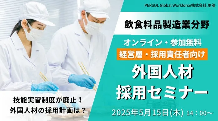 パーソルグループの一員、PERSOL Global Workforce株式会社は、飲食料品製造業の経営者や採用責任者向けに「外国人材採用セミナー」をオンラインで開催します。このセミナーは、外国人材の採用を検討している方々に向けて、必要な情報と施策を提供することを目的としています。2025年5月15日(木)14時からの開催、参加は無料です。お申し込みは5月14日(水)12時まで可能です。