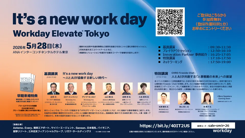 「Workday Elevate Tokyo 2026」は、将来の働き方や給与処理の革新について探る最高の場となるでしょう。この機会にぜひ参加し、未来の人材マネジメントの変革に関する知見を深めてください。